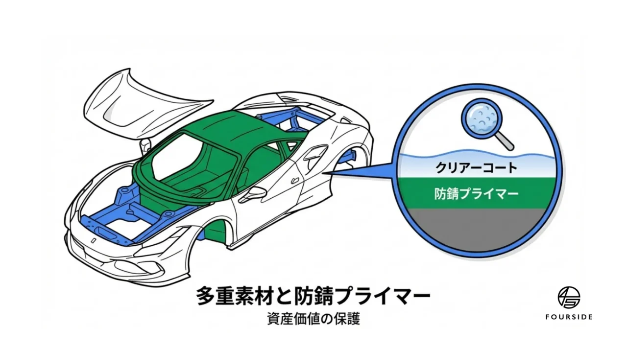 - エポキシプライマーの塗布: アルミや鋼板の酸化を物理的に遮断し、強力な防錆被膜を形成します。特にアルミボディにおいては、この工程が腐食防止の生命線となります。