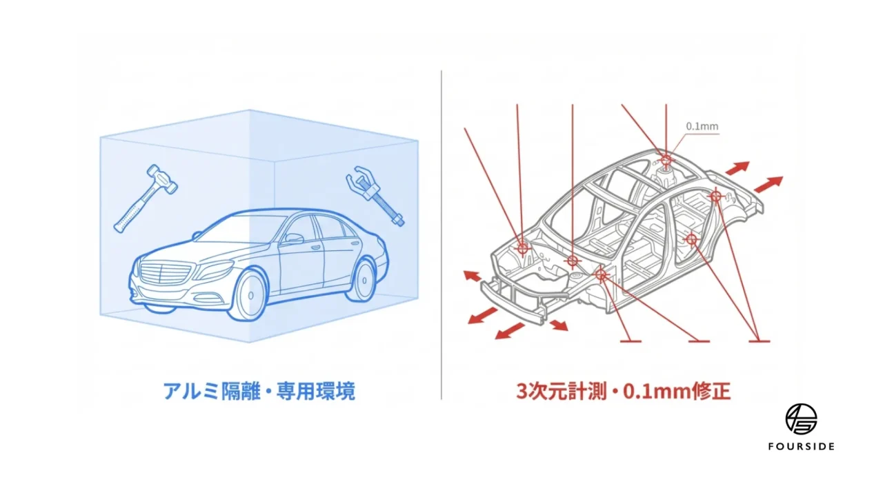 高級車・輸入車の修理には、最低限必要とされる設備があります。これらが揃っていない場合、どんなに熟練の職人であっても「物理的に不可能」な領域が出てくるためです。