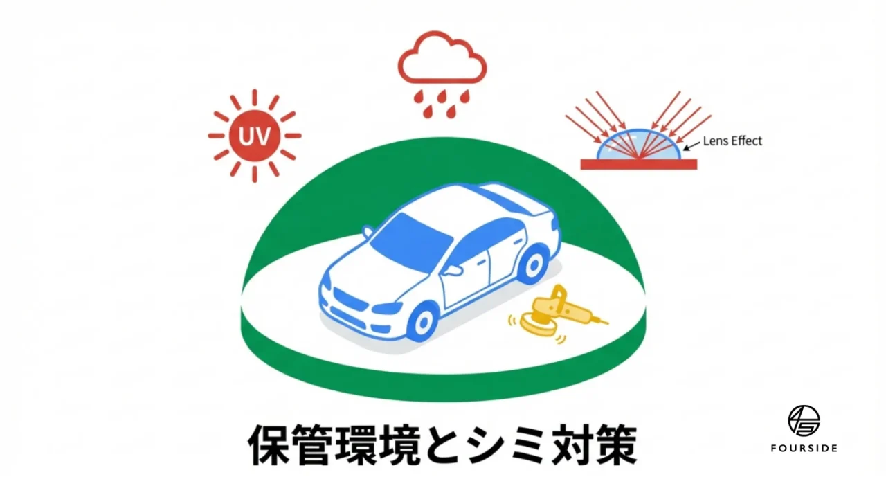 - カーポート(屋根付き)保管: 紫外線の直射を和らげ、特に「夜露」を防げるのが大きなメリットです。夜露はボディーで汚れを固着させる原因になるため、屋根があるだけでもイオンデポジットの発生率は大幅に下がります。