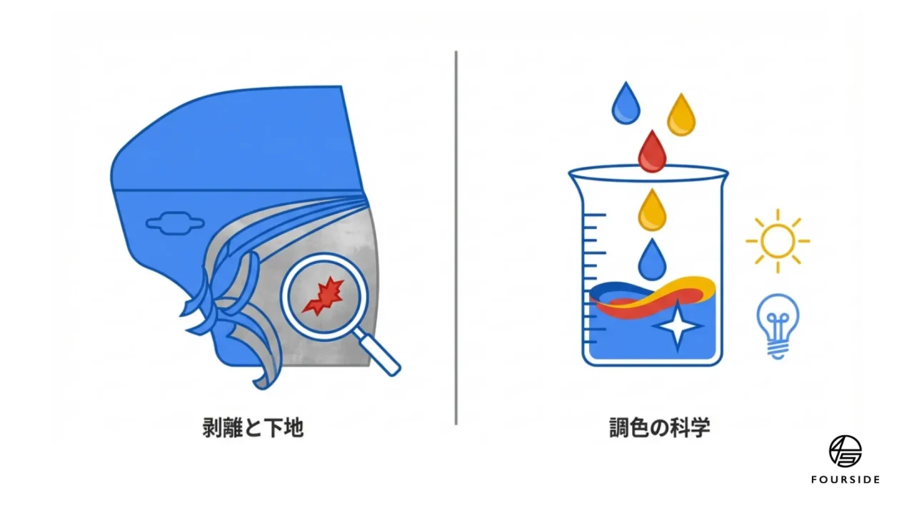 全塗装の工程において、最も重要でありながら最も体力を削られる作業が「剥離(はくり)」です。多くの安価な全塗装では、古い塗装の上からそのまま重ね塗りをする「上塗り」が行われますが、本当の意味で新車以上に蘇らせるなら、古い塗装膜をすべて剥ぎ取るフルストリップが欠かせません。