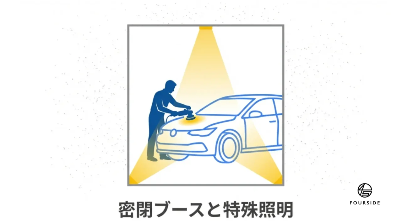 - 特殊照明の完備: 蛍光灯の下では見えない微細な傷も、高演色のLEDスポットライトやメタルハライドランプを照射することで浮かび上がります。「傷が見える環境」を作っていることが、高品質施工の最低条件です。