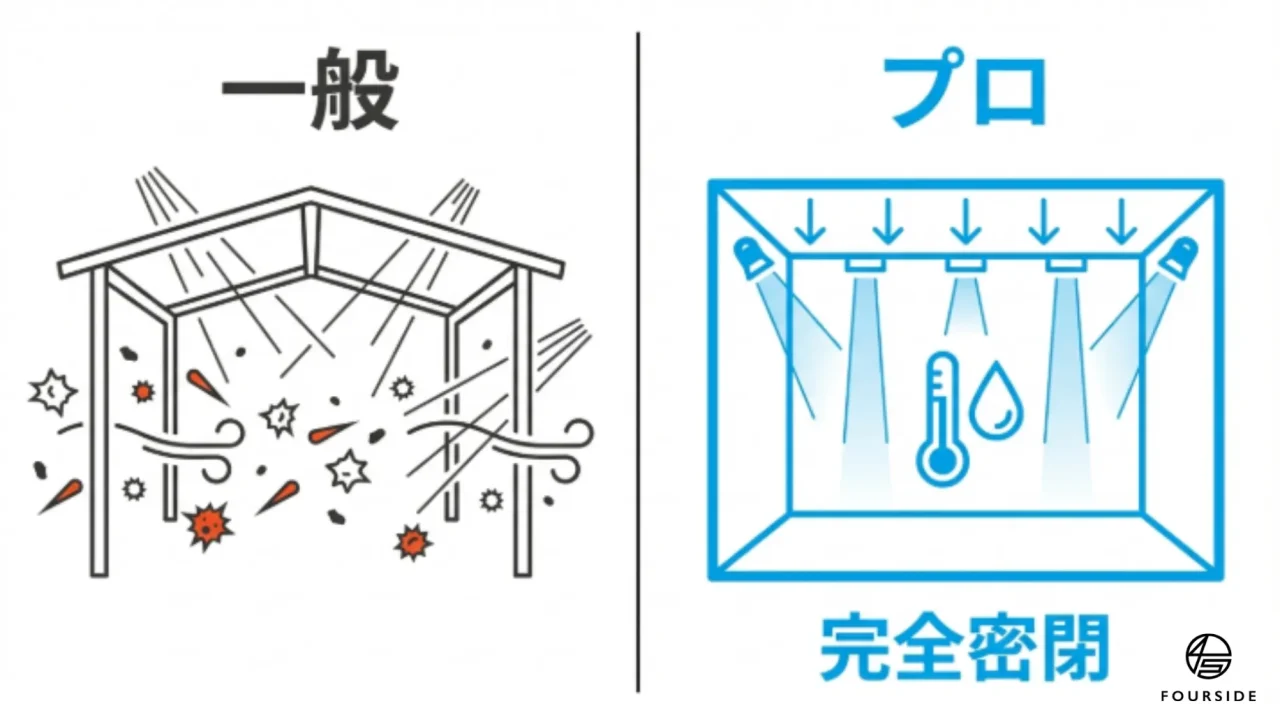 コーティングのクオリティを決定づけるのは、実は「目に見えない空気」です。液剤が硬化する過程で、温度や湿度、そして塵の影響をどれだけ排除できるか。ディーラーの整備工場の一角で行われる施工と、専門店が誇る完全密閉の「専用ブース」では、コーティングの仕上がりと耐久性に天と地ほどの差が生まれます。