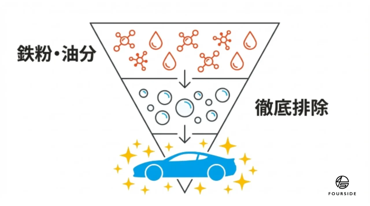 目に見える砂や泥だけでなく、塗装に突き刺さった鉄粉や、目に見えない無機質のスケール汚れ(水垢)は、通常のシャンプーでは落ちません。