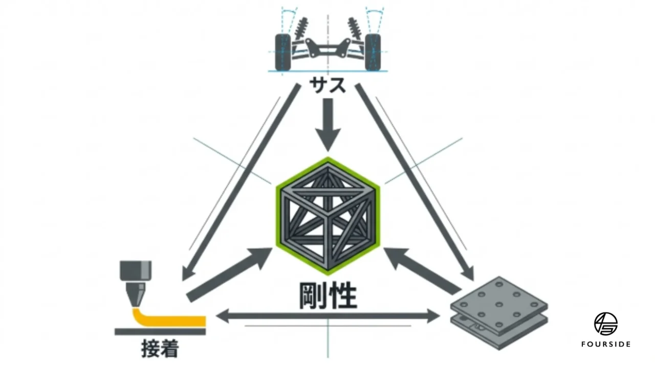 - ねじり剛性のアップ: 接合部全体の密着度を高めることで、コーナーでのフレームの「たわみ」を抑え、よりシャープなハンドリングを実現します。